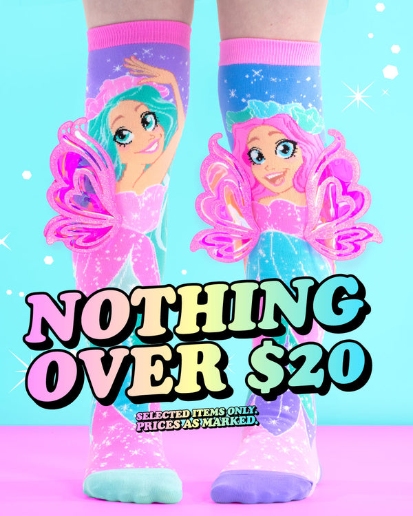 A range of colourful wacky socks is available for babies aged 1-2 as well as a MADMIA toddler range of crazy fun socks for kids aged 3-5. Our most popular crazy socks designs are ideally sized for kids & teens but can fit ages 6-99. MADMIA has some groovy socks designs for adults too. These bright & bold fun knee high socks in cool designs fire up the fun factor so you shine bright like a star!