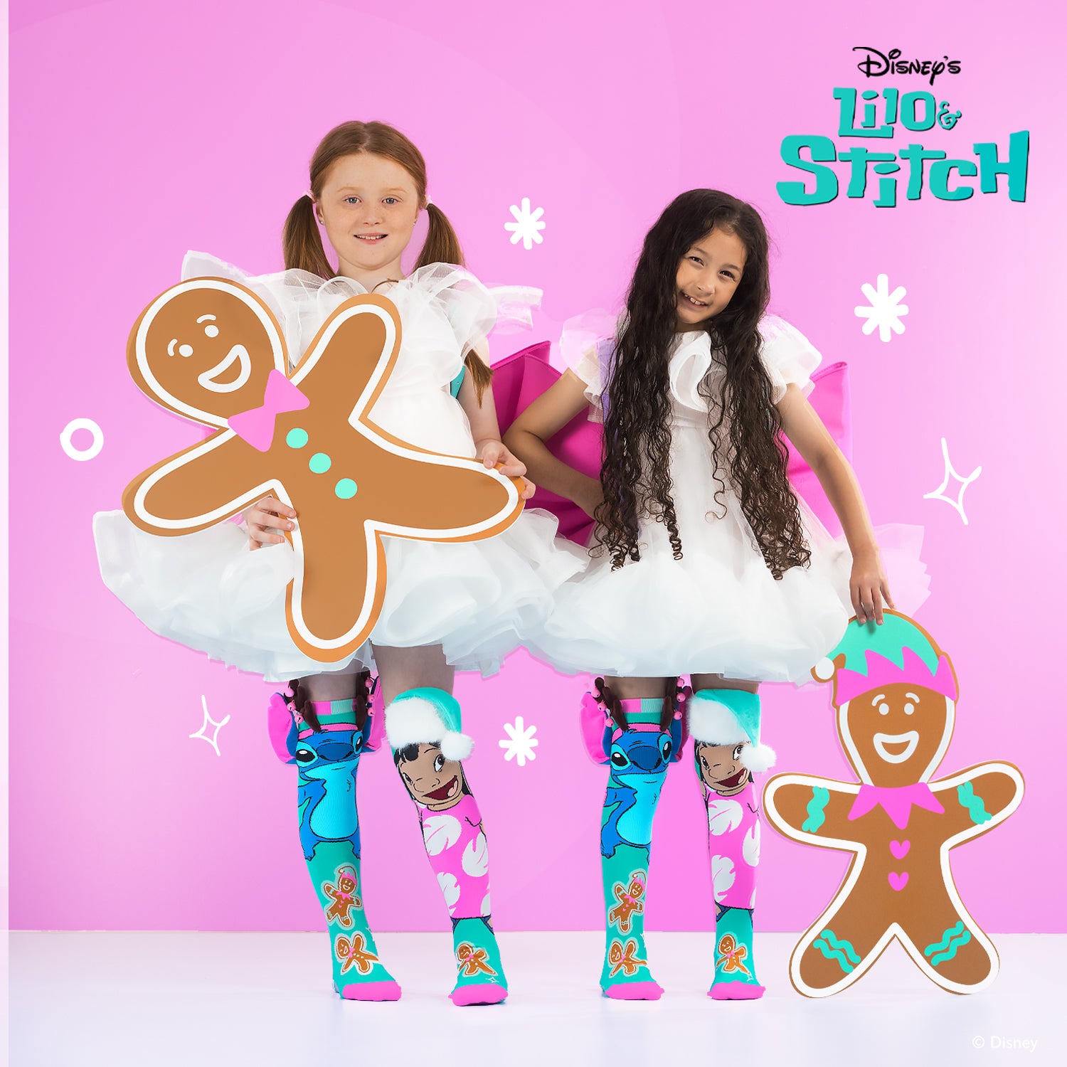 Bring Christmas cheer to your feet! Featuring Stitch with reindeer antlers and ears and Lilo in a Santa hat — plus the cutest gingerbread cookies for extra sweetness.