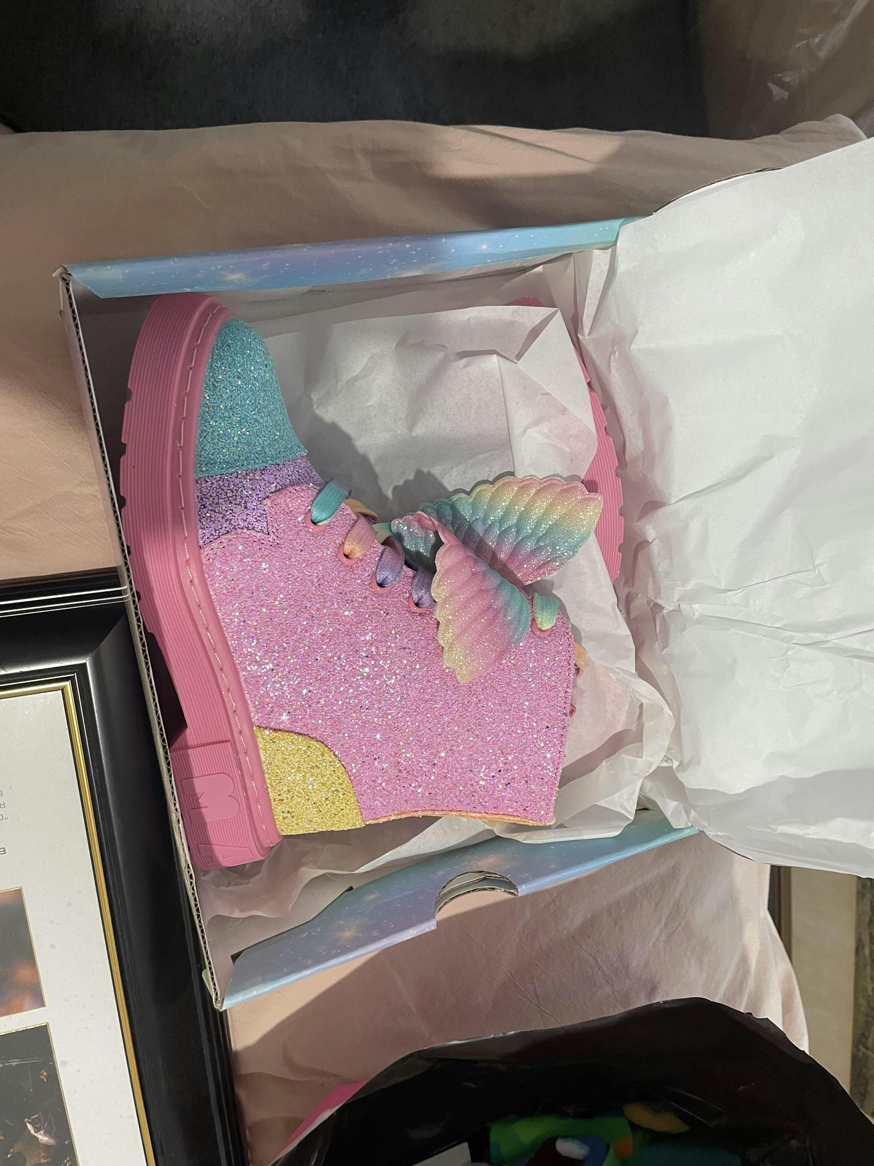 The most colourful and magical pastel boots ever, the Rainbow Glitter Boots! An incredibly magical product of the highest quality with rainbow butterfly wings and pompoms on the laces. These unique shoes come in all sizes ranging from kids to adults so be sure to order before we sell out! Every girl's dream is a pair of MADMIA Rainbow Glitter Shoes.