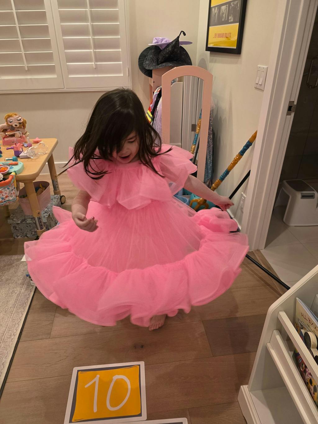 Bursting with layers of vibrant pink tulle and playful frills, this dress is all about creating magical moments. Perfect for parties, birthdays or just going out and about, this dress brings a pop of colour and joy wherever it goes.