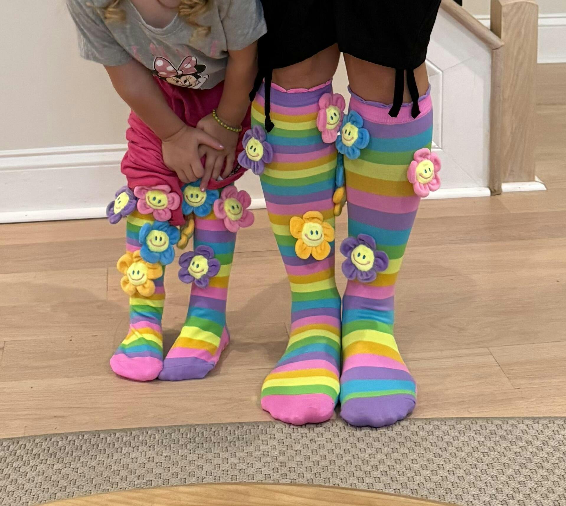 Step into spring with our colourful flower fun socks featuring custom-made plush flowers!